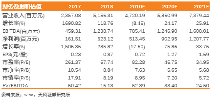 公司数通市场领先地位进一步强化,5G产品持续批量出货,中回传高端产品有望突破。展望未来,公司在高速数通光模块行业龙头地位稳固,云计算资本开支持续回暖驱动公司长期成长;5G电信前传产品批量交付,价值量更高的中回传领域有望突破,形成数通+电信双轮驱动公司长期成长。预计公司19-21年归母净利润分别为5.1、9.0、12.1亿元,对应20年47倍、21年35倍市盈率,维持“增持”评级。