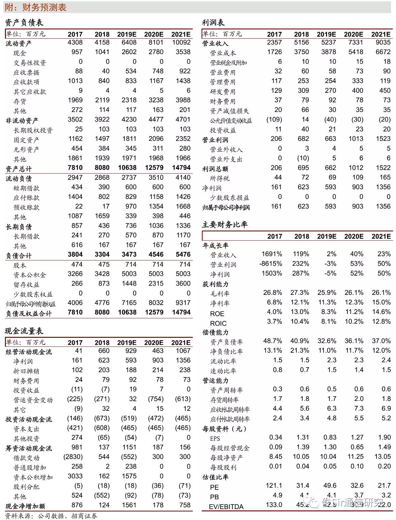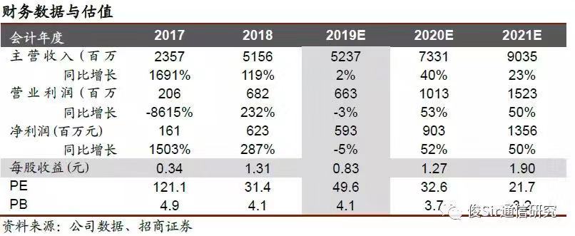 公司在北美和国内数据中心市场保持龙头地位,拥有优质的芯片供应渠道及强劲的研发实力,随着数通市场的逐步回暖以及400G产品供货量的提升,公司盈利能力有望逐步提升;在5G基站光模块市场,公司拥有前传、中传、回传全面的5G基站光模块产品布局,5G时代公司有望成为基站光模块主要提供商。我们预计公司2019-2021年净利润分别为5.93亿元、9.03亿元、13.56亿元,对应2019-2021年PE分别为49.6X、32.6X和21.7X,维持“强烈推荐-A”评级。