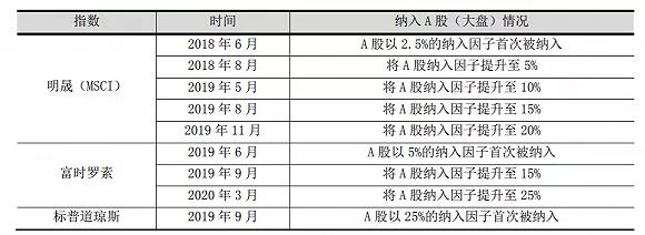 随着金融业对外开放的不断推进,明晟(MSCI)、富时罗素、标普道琼斯三大国际指数公司先后将A股纳入其全球指数体系, 并相继提高纳入因子。